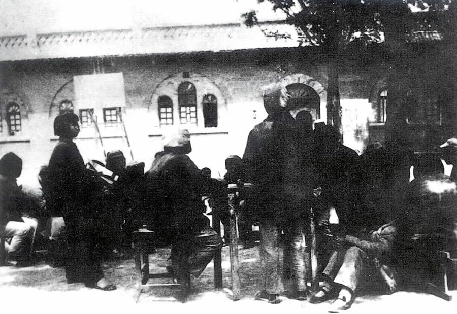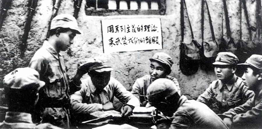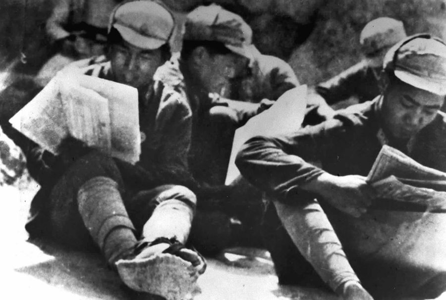 中國人民抗日軍政大學的學員在學習整風文件。 新華社圖片