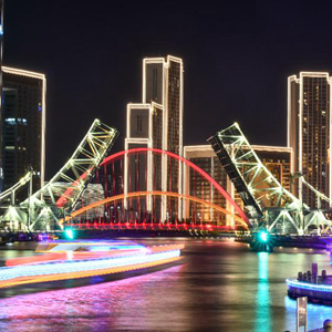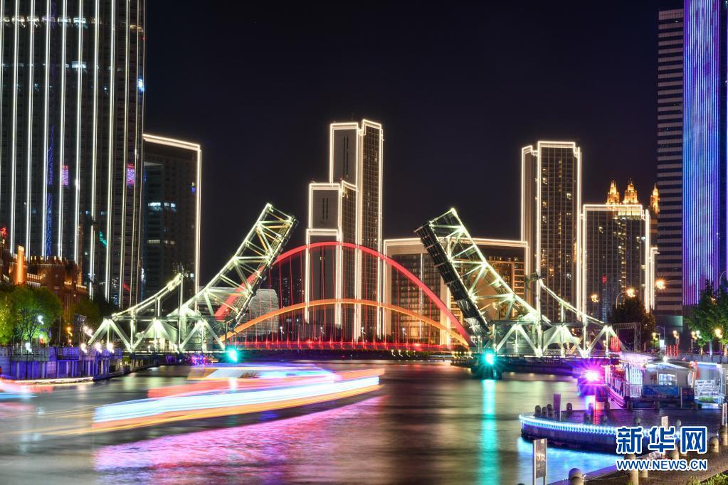 這是5月1日晚拍攝的天津解放橋景觀(長時間曝光照片)。新華社發(fā)(孫凡越 攝)