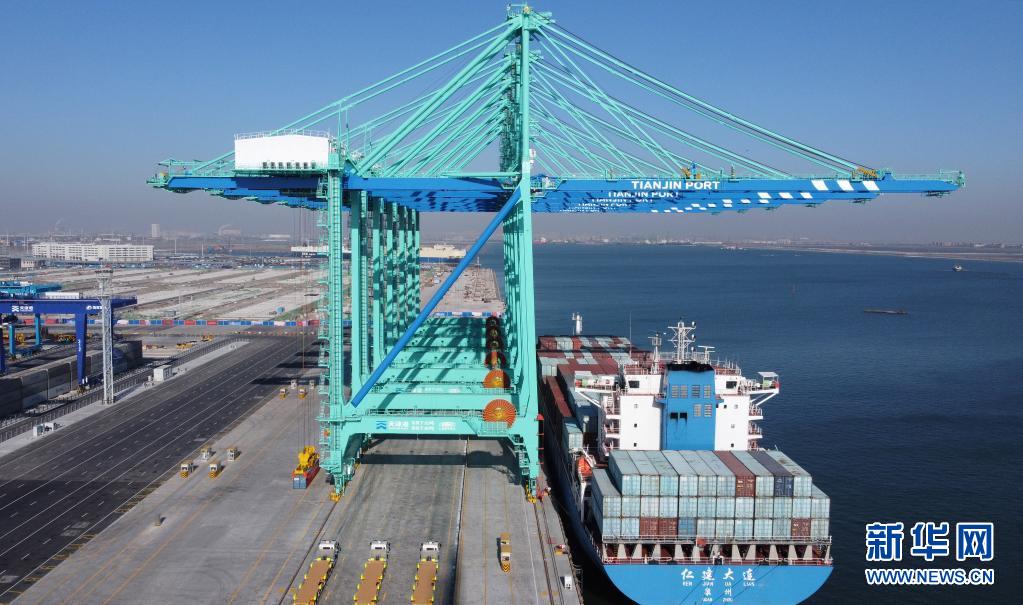 這是2021年1月17日拍攝的天津港北疆港區(qū)C段智能化集裝箱碼頭一號泊位(無人機照片)。新華社記者趙子碩 攝