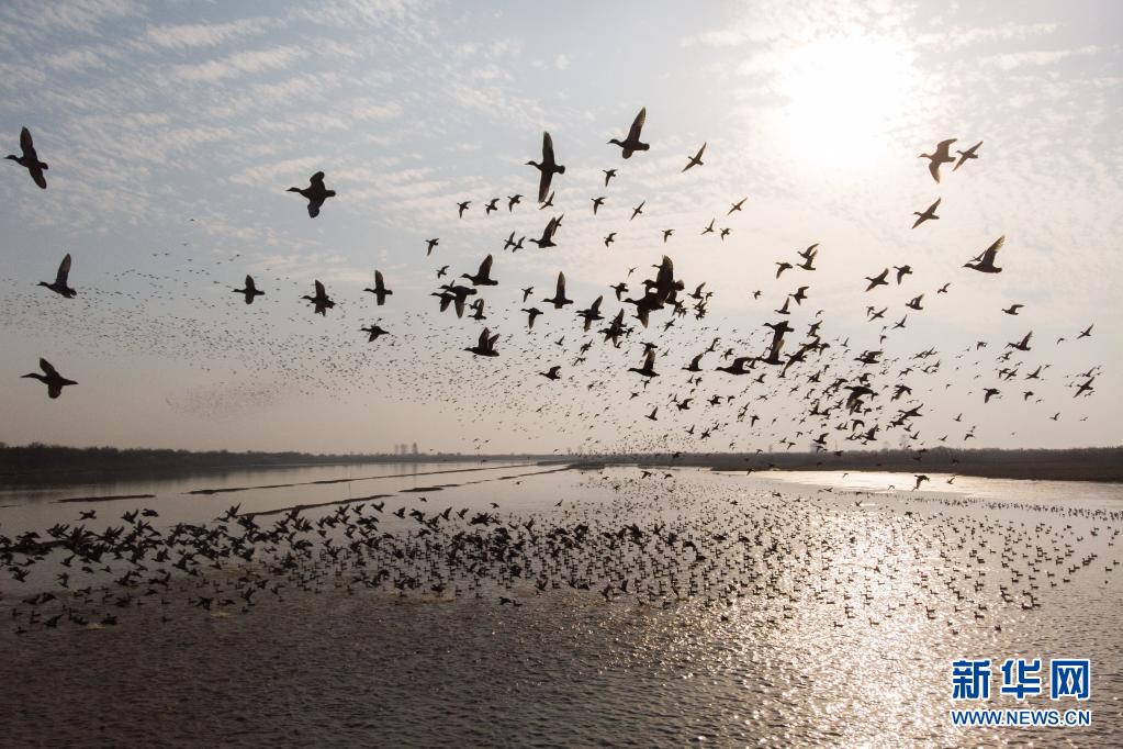 成群羅紋鴨在湖南西洞庭湖國(guó)家級(jí)自然保護(hù)區(qū)飛翔(2020年11月11日攝,無人機(jī)照片)。新華社記者 陳思汗 攝