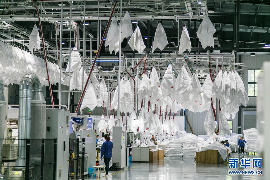 這是2019年4月28日在湖南省長(zhǎng)沙市拍攝的夢(mèng)潔家紡智能生產(chǎn)線。新華社記者 陳思汗 攝