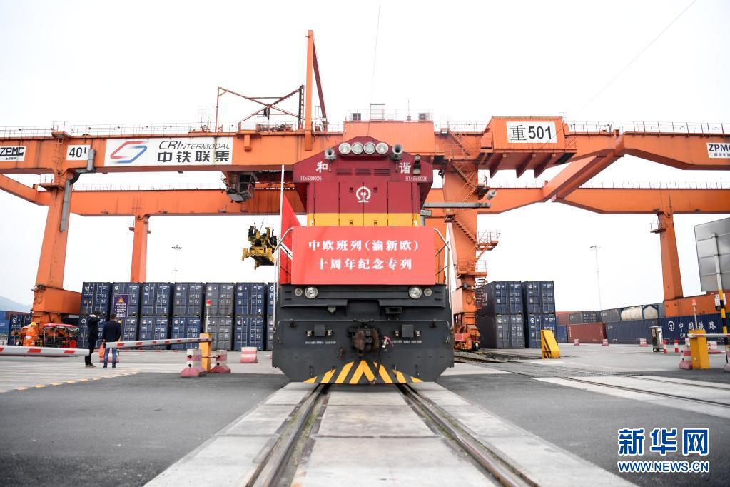 中歐班列(渝新歐)十周年紀(jì)念專列在重慶團結(jié)村站等待發(fā)車(3月19日攝)。新華社記者 唐奕 攝