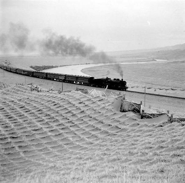 1958年8月1日,包蘭鐵路通車。這是列車通過(guò)沙坡頭。新華社圖片
