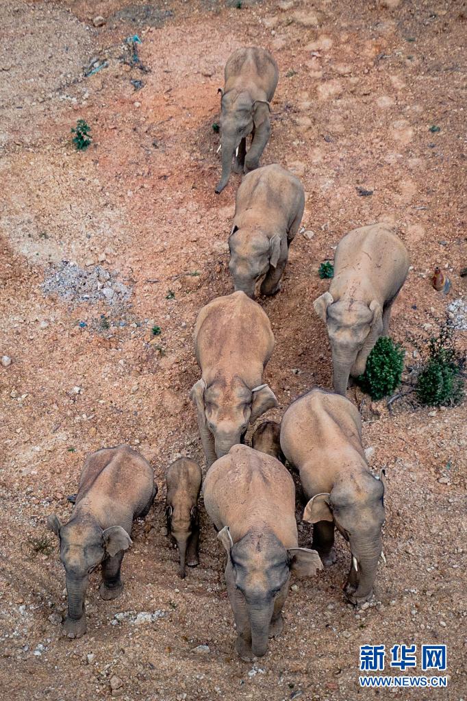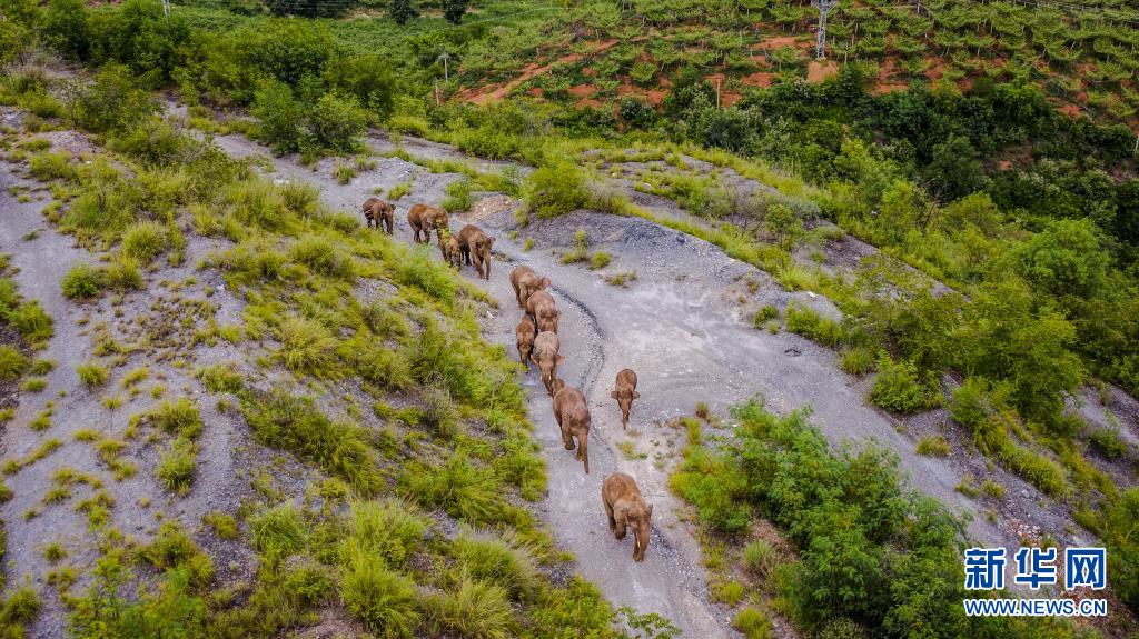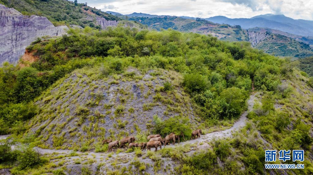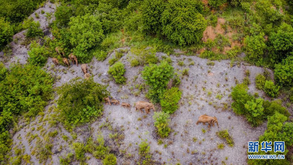 這是5月28日在云南省玉溪市峨山縣境內(nèi)拍攝的象群(無(wú)人機(jī)照片)。新華社記者 胡超 攝