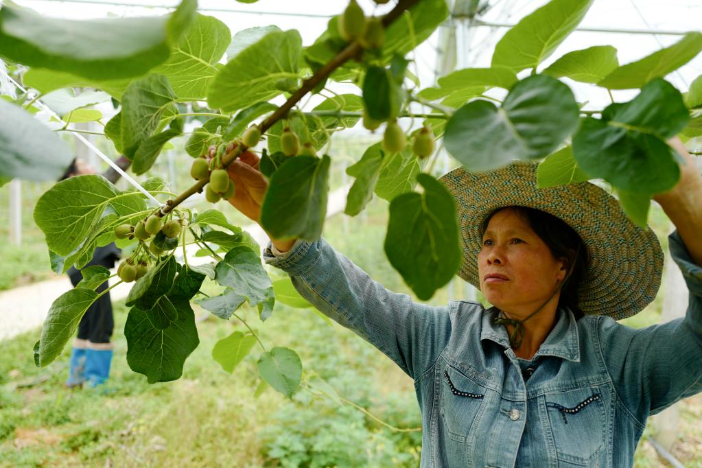 圖為長坪村村民在獼猴桃種植大棚內(nèi)進行疏果作業(yè)。(新華社記者劉潺 攝)