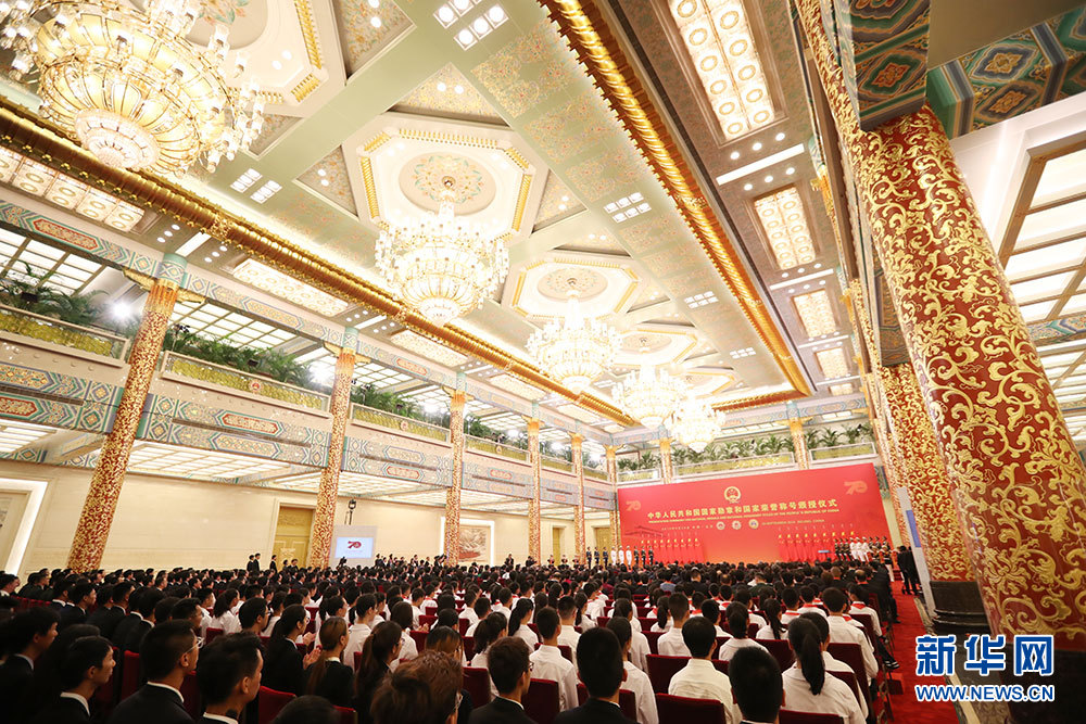 ??? 9月29日上午10時(shí),中華人民共和國(guó)國(guó)家勛章和國(guó)家榮譽(yù)稱(chēng)號(hào)頒授儀式在人民大會(huì)堂隆重舉行。圖為頒授儀式現(xiàn)場(chǎng)。新華網(wǎng) 陳杰 攝