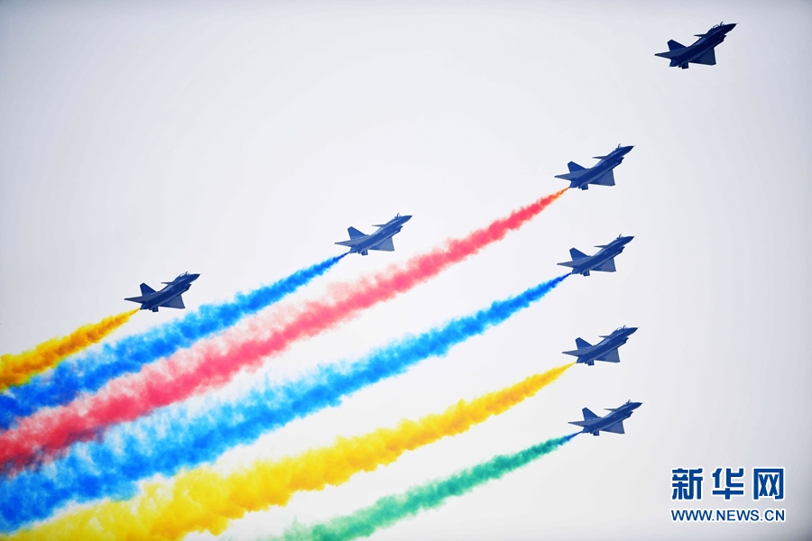 “七道彩煙寓意新中國走過70年輝煌歷程,絢麗繽紛,蒸蒸日上?!笨罩刑蓐犞笓]部政治工作辦公室主任武祥峰介紹,七道彩煙中,紅色為黨旗、國旗主色調(diào),表示人民軍隊一顆紅心永向黨;藍(lán)色為空天主色調(diào),寓意人民空軍奮飛藍(lán)天、飛行萬里不迷航;黃色代表炎黃子孫,象征中華民族昂首闊步邁向偉大復(fù)興;綠色代表生機(jī)活力,昭示偉大祖國生機(jī)盎然。七道彩煙左右對稱排列,寓意中華民族以和為貴、向往和平,昭示中國軍隊崇尚和平、捍衛(wèi)和平的堅強(qiáng)決心。