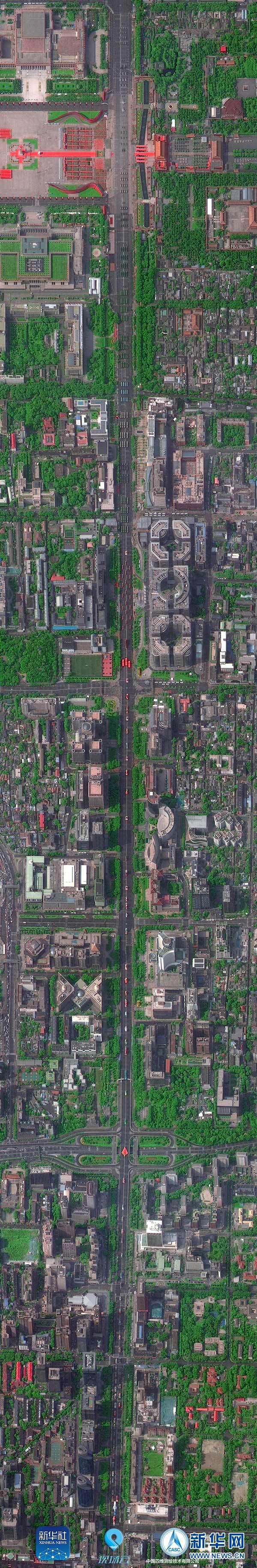 這是“高景1號”拍攝的北京長安街全畫幅衛(wèi)星圖(10月1日攝)。 10月1日上午,慶祝中華人民共和國成立70周年大會在北京天安門廣場隆重舉行。新華社聯(lián)合多家單位調(diào)用多顆國產(chǎn)衛(wèi)星俯瞰閱兵,從“最高機(jī)位”發(fā)回這三張珍貴的長安街全畫幅衛(wèi)星圖。 新華社發(fā)(中國四維測繪技術(shù)有限公司提供)