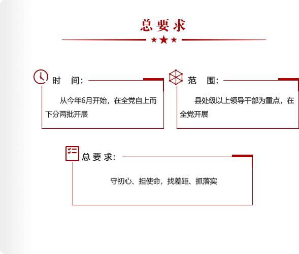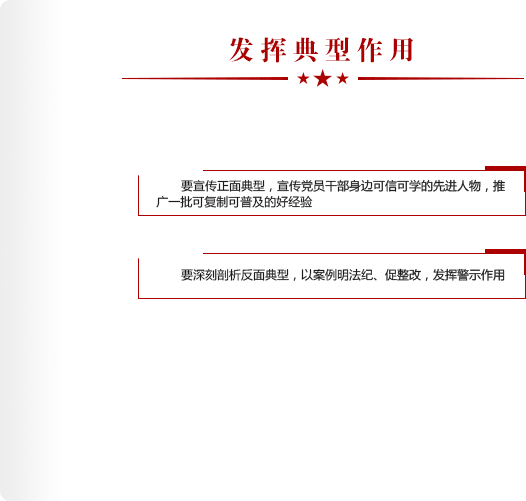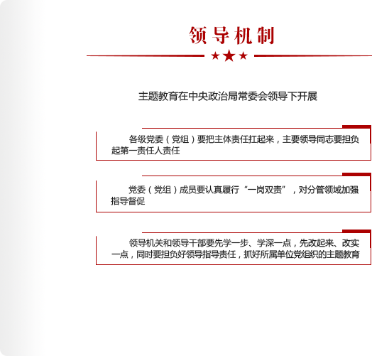 • 主題教育是以習(xí)近平同志為核心的黨中央作出的重大部署,領(lǐng)導(dǎo)干部要提升政治站位,擔(dān)負(fù)好領(lǐng)導(dǎo)指導(dǎo)責(zé)任,抓好所屬單位黨組織的主題教育。對消極對待、敷衍應(yīng)付的,要嚴(yán)肅批評;對走形變樣、問題嚴(yán)重的,要給予組織處理,切實(shí)解決執(zhí)行能力不強(qiáng)、執(zhí)行底氣不夠等問題,確保主題教育取得實(shí)實(shí)在在成效。 [詳細(xì)]