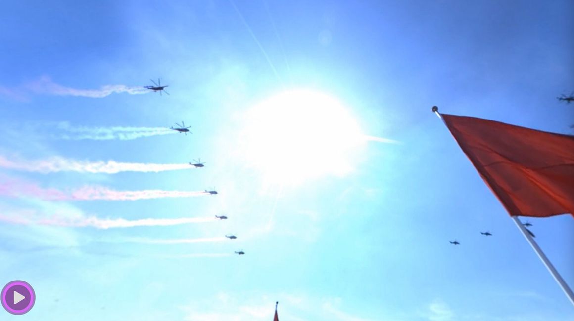 蔚藍(lán)的天空中,6架直升機(jī)護(hù)衛(wèi)著國(guó)旗和軍旗、20架直升機(jī)飛成“70”字樣、7架教練機(jī)拉出7道彩煙——率先從天安門廣場(chǎng)飛過(guò)的空中護(hù)旗方隊(duì),揭開(kāi)了勝利日大閱兵的序幕。9月3日,雄偉的天安門,寬闊的長(zhǎng)安街,見(jiàn)證著這場(chǎng)大閱兵的一個(gè)又一個(gè)精彩瞬間。
