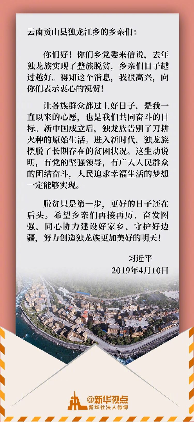2018年,獨龍江鄉(xiāng)6個行政村整體脫貧,獨龍族實現(xiàn)整族脫貧。當(dāng)?shù)厝罕娢朽l(xiāng)黨委給習(xí)近平總書記寫信,匯報獨龍族實現(xiàn)整族脫貧的喜訊,表達(dá)了繼續(xù)堅定信心跟黨走、為建設(shè)好家鄉(xiāng)同心奮斗的決心。