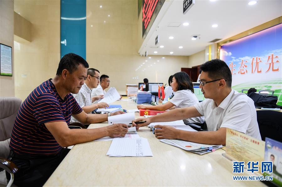 8月19日,內(nèi)蒙古自治區(qū)自然資源政務(wù)大廳的工作人員在辦理審批手續(xù)。新華社記者 劉磊 攝