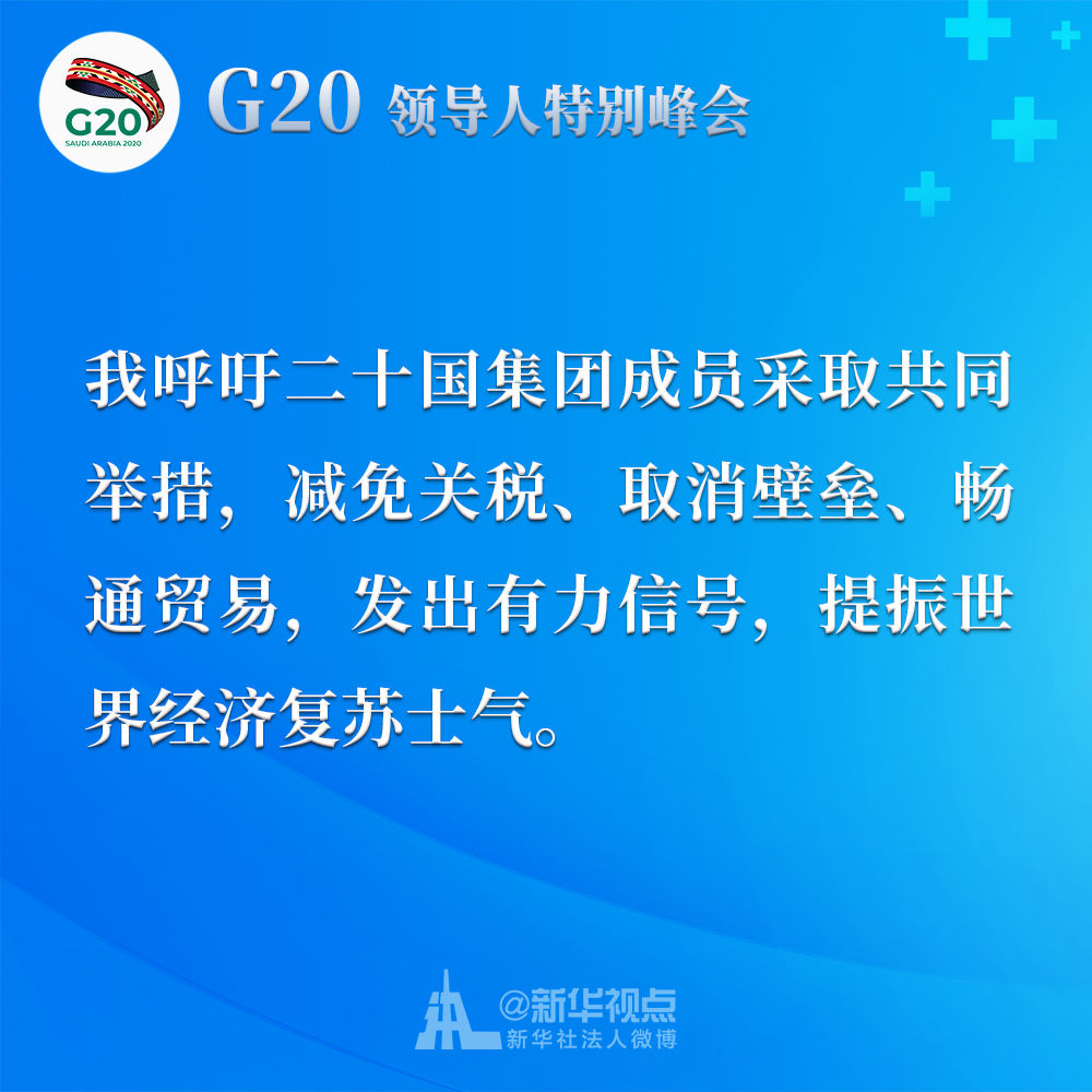 我呼吁二十國集團成員采取共同舉措,減免關(guān)稅、取消壁壘、暢通貿(mào)易,發(fā)出有力信號,提振世界經(jīng)濟復(fù)蘇士氣。我們應(yīng)該制定二十國集團行動計劃,并就抗疫宏觀政策協(xié)調(diào)及時作出必要的機制性溝通和安排。