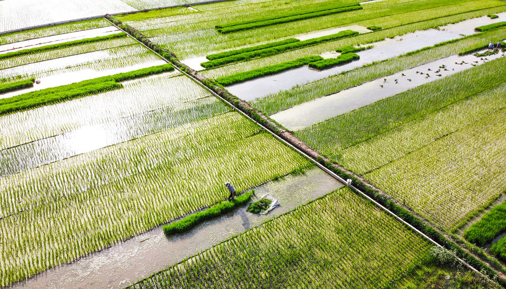 2020年6月14日,農民在洛陽市孟津縣會盟鎮(zhèn)黃河岸邊的萬畝優(yōu)質水稻種植示范基地內移栽水稻秧苗(無人機照片)。新華社發(fā)(黃政偉 攝)