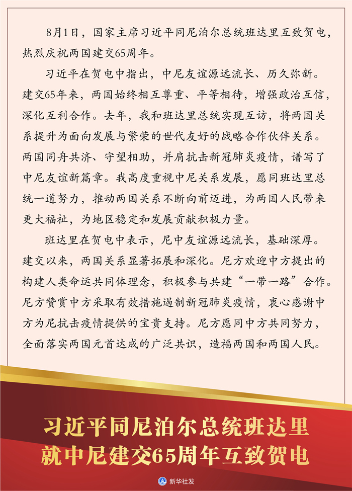 習(xí)近平在賀電中指出,中尼友誼源遠(yuǎn)流長、歷久彌新。建交65年來,兩國始終相互尊重、平等相待,增強(qiáng)政治互信,深化互利合作。去年,我和班達(dá)里總統(tǒng)實(shí)現(xiàn)互訪,將兩國關(guān)系提升為面向發(fā)展與繁榮的世代友好的戰(zhàn)略合作伙伴關(guān)系。兩國同舟共濟(jì)、守望相助,并肩抗擊新冠肺炎疫情,譜寫了中尼友誼新篇章。我高度重視中尼關(guān)系發(fā)展,愿同班達(dá)里總統(tǒng)一道努力,推動兩國關(guān)系不斷向前邁進(jìn),為兩國人民帶來更大福祉,為地區(qū)穩(wěn)定和發(fā)展貢獻(xiàn)積極力量。