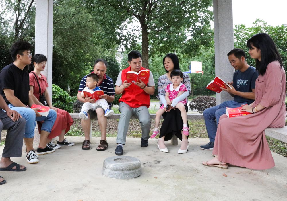 2020年7月4日,在浙江省長(zhǎng)興縣小浦鎮(zhèn)中山村的法治長(zhǎng)廊里,黨員志愿者為村民宣講民法典。新華社記者 徐昱 攝