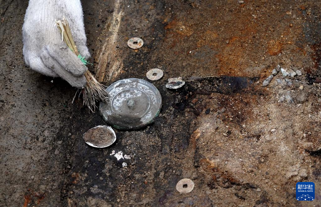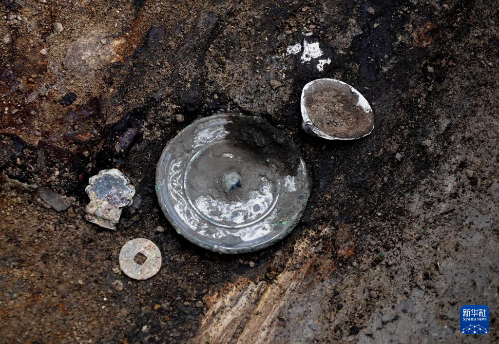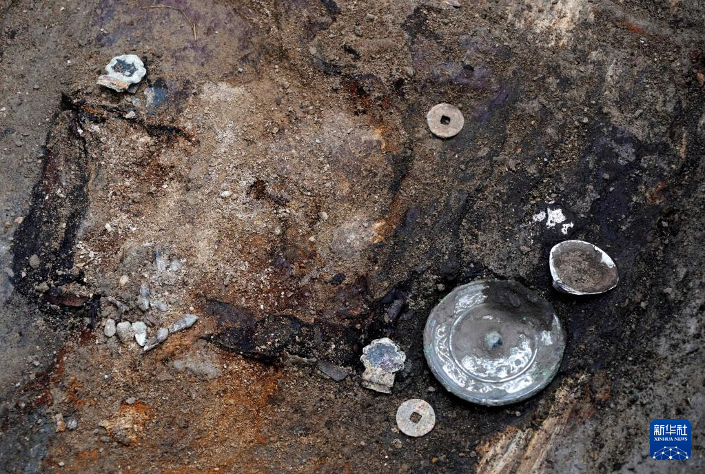 这是宋国故城遗址内的唐代墓葬出土的铜钱、铜镜等(3月25日摄)。
