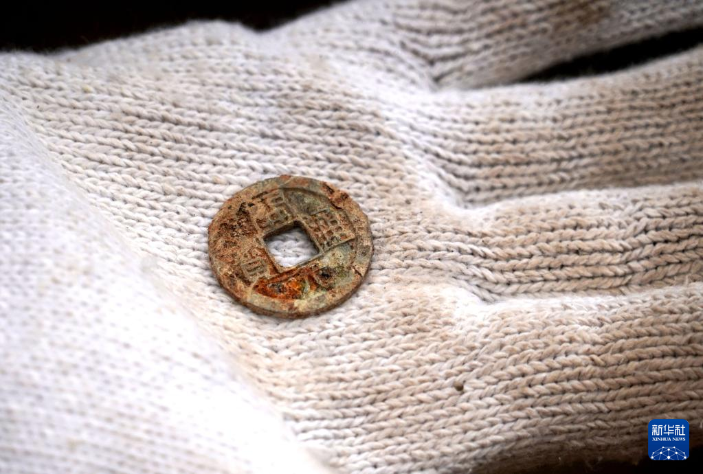 这是宋国故城遗址内的唐代墓葬出土的铜钱(3月25日摄)。