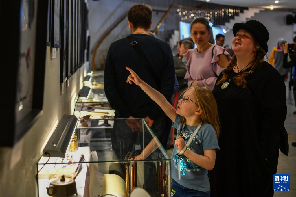 3月30日,人们在俄罗斯莫斯科达尔文博物馆参观中国画和绘画工具。