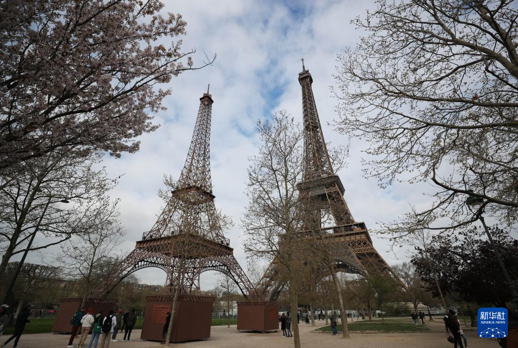 这是4月3日在法国巴黎拍摄的埃菲尔铁塔(左)和“小埃菲尔铁塔”。