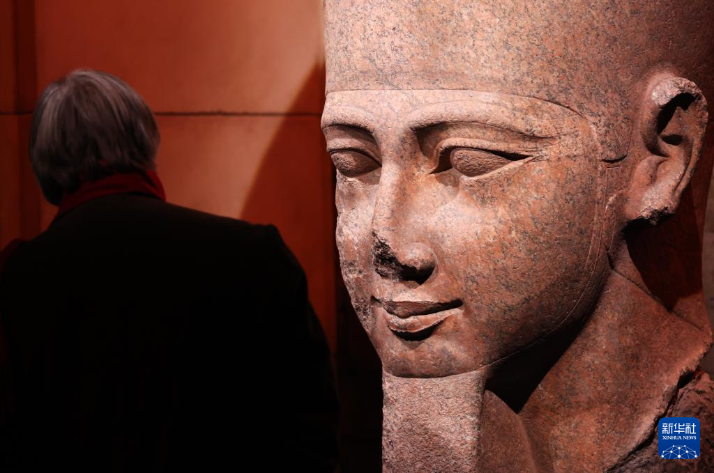 4月6日,媒体记者在法国巴黎参观拉美西斯二世头部雕像。