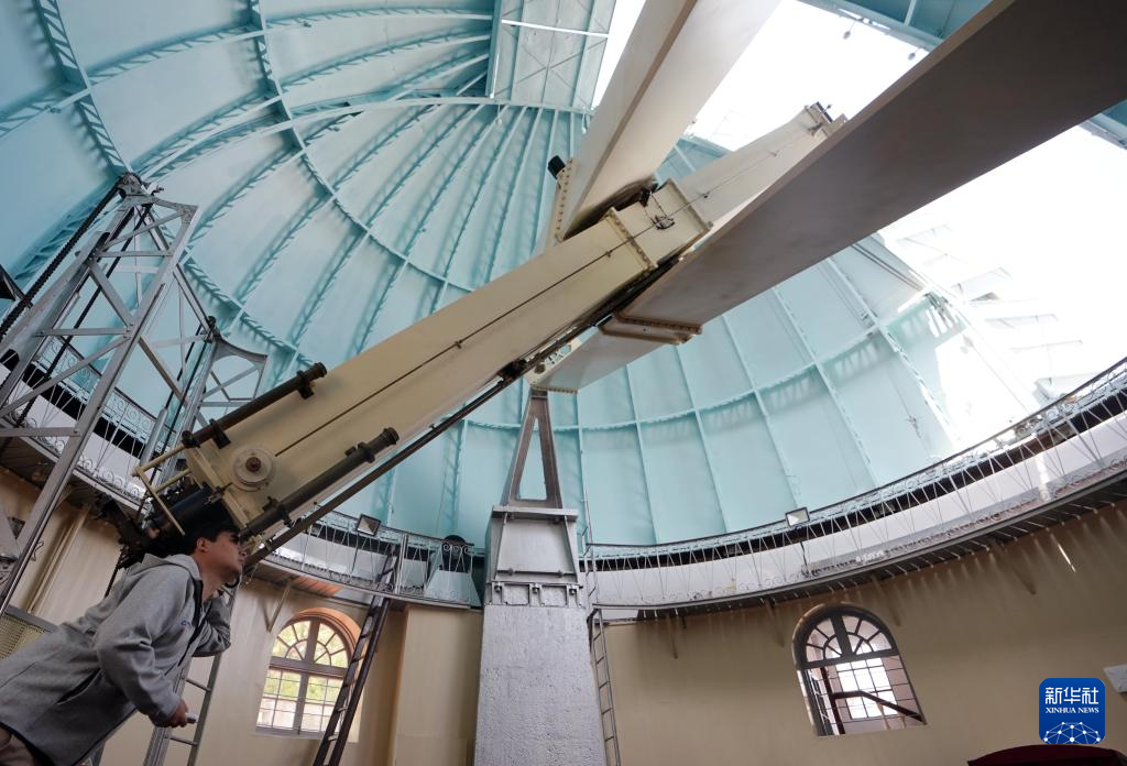 4月27日,工作人员在调节40厘米口径大双筒折射望远镜的观测角度。