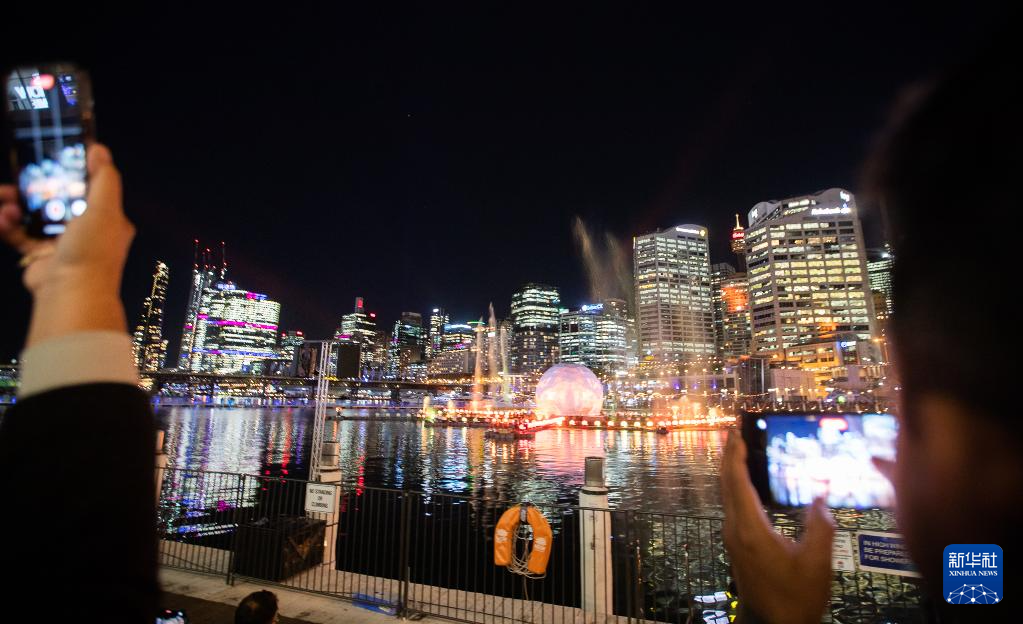 6月7日,在澳大利亚悉尼,游客欣赏灯光秀并拍照。
