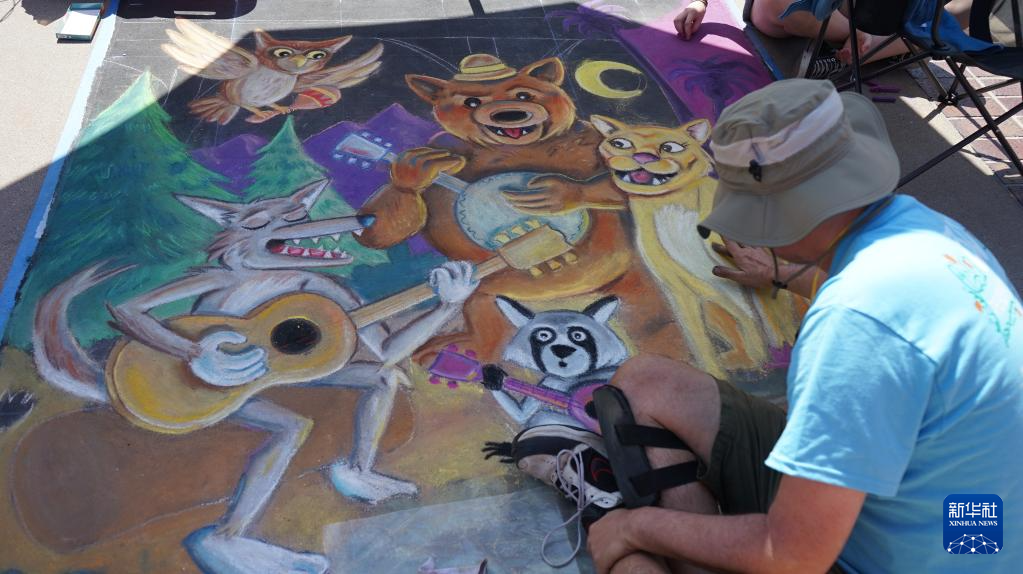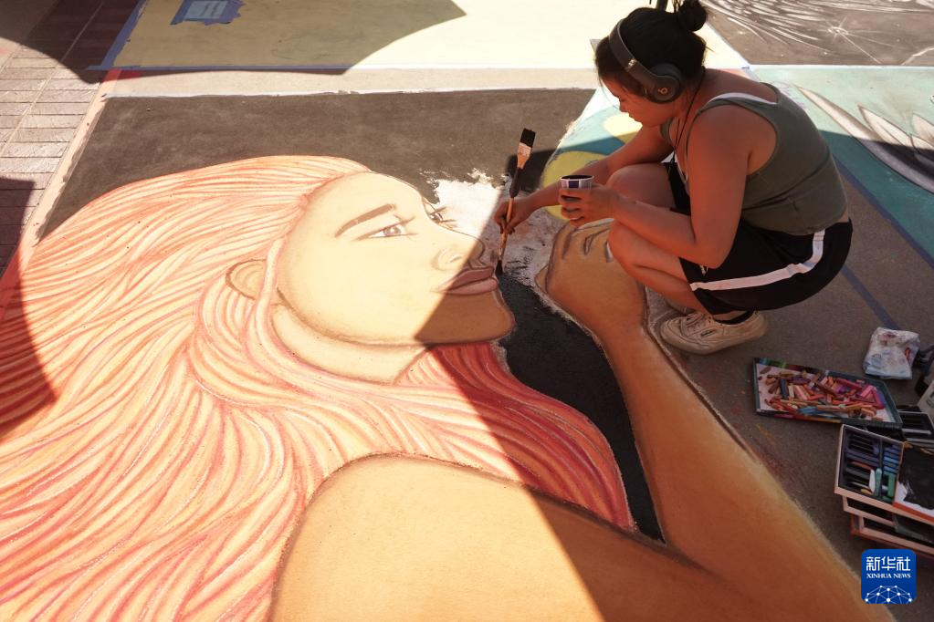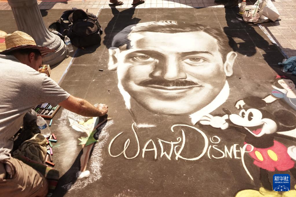 6月18日,艺术工作者在美国加利福尼亚州帕萨迪纳市举行的粉笔画节上创作。