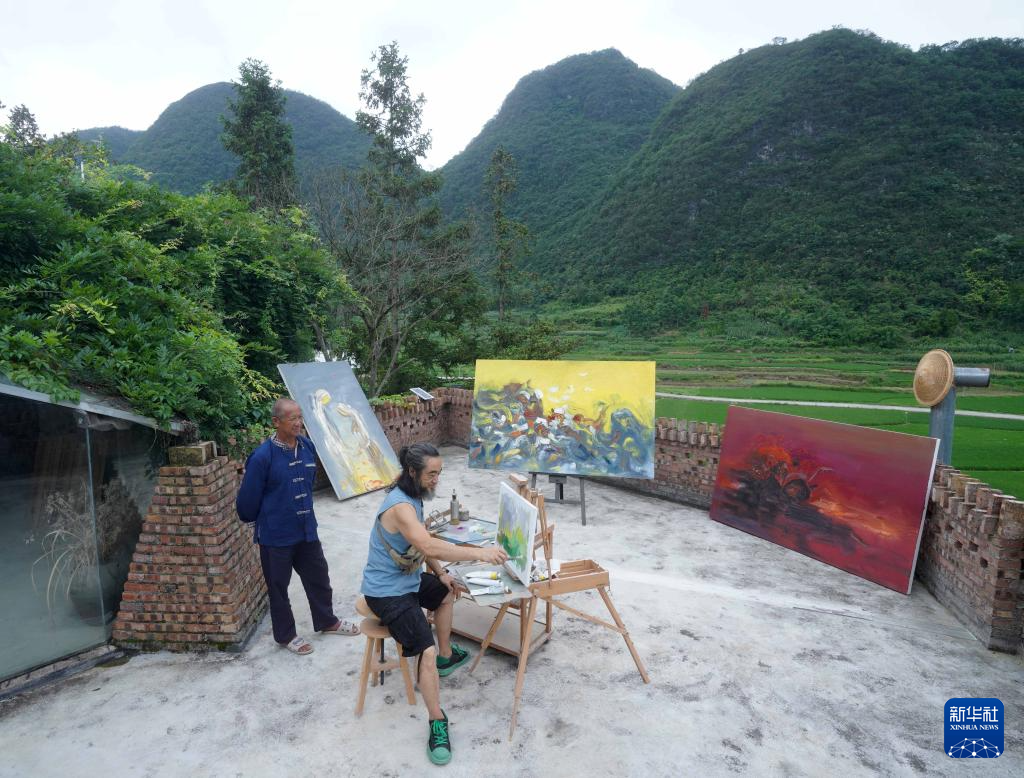 7月3日,在贵州省荔波县朝阳镇洪江村,来自各地的艺术从业者进行艺术交流。