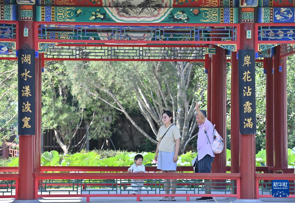 8月28日,参观者在中国园林博物馆镜影亭参观。