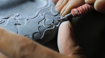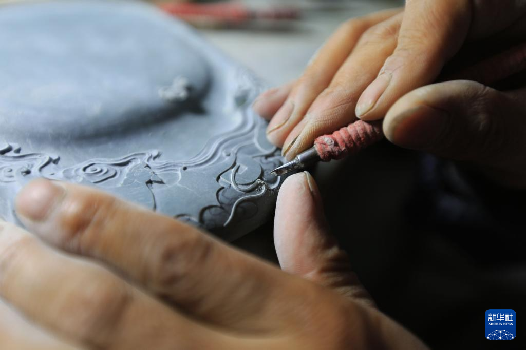 10月24日,艺人在甘肃省定西市临洮县洮砚艺术馆雕刻制作洮砚。