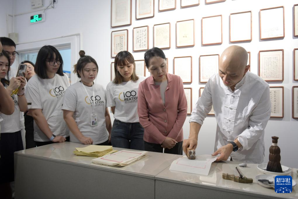 当日,十竹斋木版水印艺术作品展在暨南大学广州石牌校区举行。国家非遗项目木版水印技艺代表性传承人魏立中在展览现场为学生导赏、授课,并指导学生体验木版水印手作的乐趣。