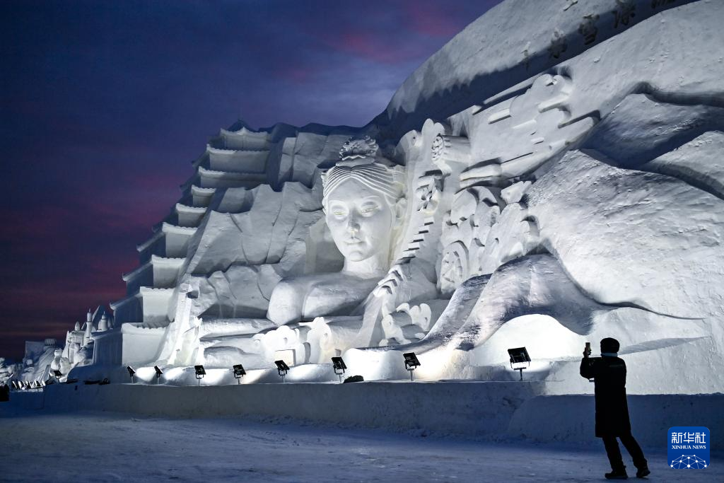 12月12日,游客在长春冰雪新天地一处雪雕前拍照。