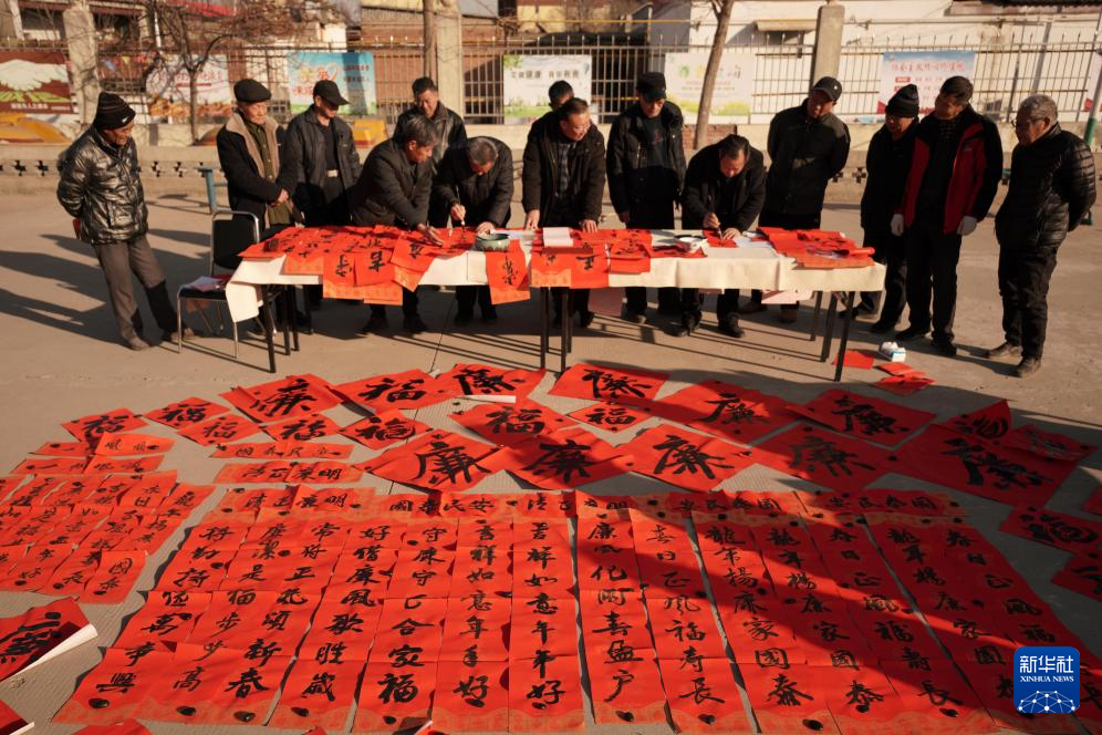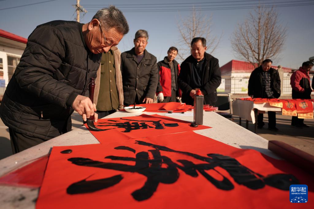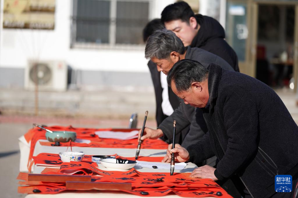 1月28日,书法爱好者在河北省巨鹿县西郭城村书写廉政题材春联(无人机照片)。