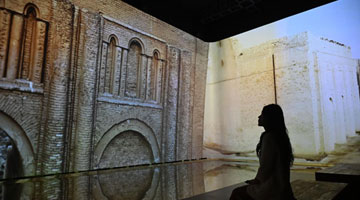 5月27日,在位于埃及首都开罗的埃及国家博物馆,工作人员对古埃及18王朝法老埃赫那吞半身像进行吊装。