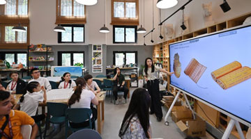 在河南省禹州市神垕镇,河南农业大学的学生在挑选钧瓷产品(7月3日摄)。