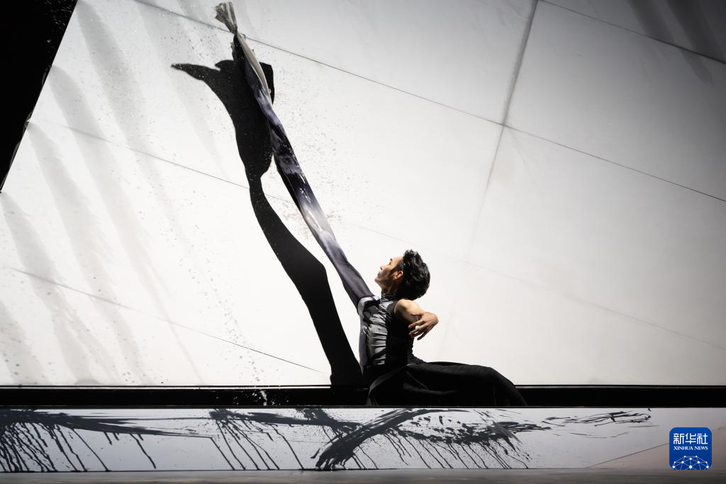 香港舞蹈团《快雪时晴》在舞台设计上加入水墨元素,舞者与之互动会留下书法般的痕迹(10月11日摄)。新华社发(香港舞蹈团供图)