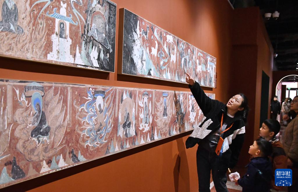 3月29日,观众在参观“如是莫高”敦煌艺术大展中展出的复刻壁画。