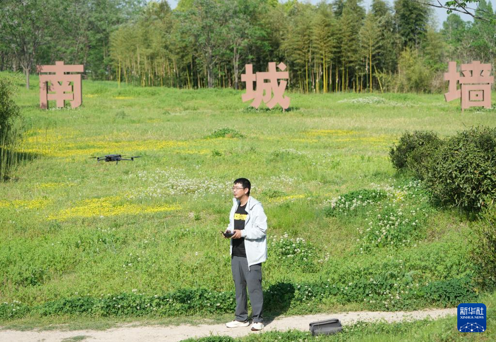科研人员在良渚古城用无人机拍摄遗址形态格局(4月18日摄)。