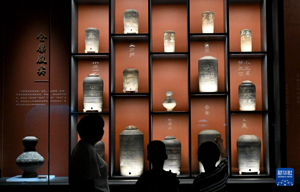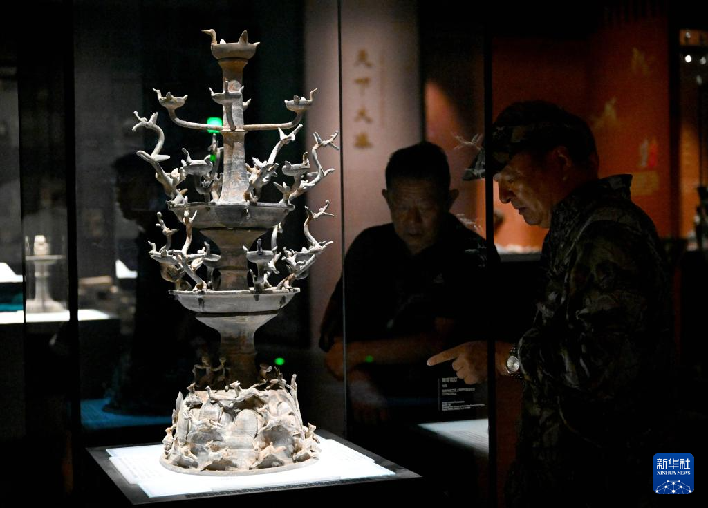 7月16日,参观者在汉魏洛阳故城遗址博物馆观看展品陶百花灯。