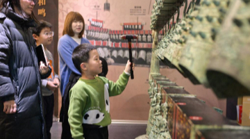 1月13日,游客在哈尔滨冰雪大世界园区内的“冰马俑”冰雕附近游玩。