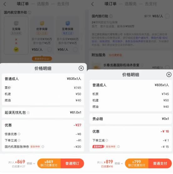 “看似最便宜,实则更昂贵”。部分平台瞄准用户“比价选低”的消费习惯,通过“价格诱导”策略引导点击。例如,在某订票App上,系统按价格从低到高排序后,页面最低价显示为698元,可到了结算环节,这个票价还要加上被捆绑的61元延误礼包,即便减去平台给的27元优惠,最终实付金额为869元。而当消费者返回重新选择标价为709元的“裸价”机票时,在机票、基建费、燃油费完全相同的前提下,虽然只能减去16元的平台优惠,却因无捆绑礼包,最终实付仅为819元,反而比所谓的“最低价”便宜50元。
