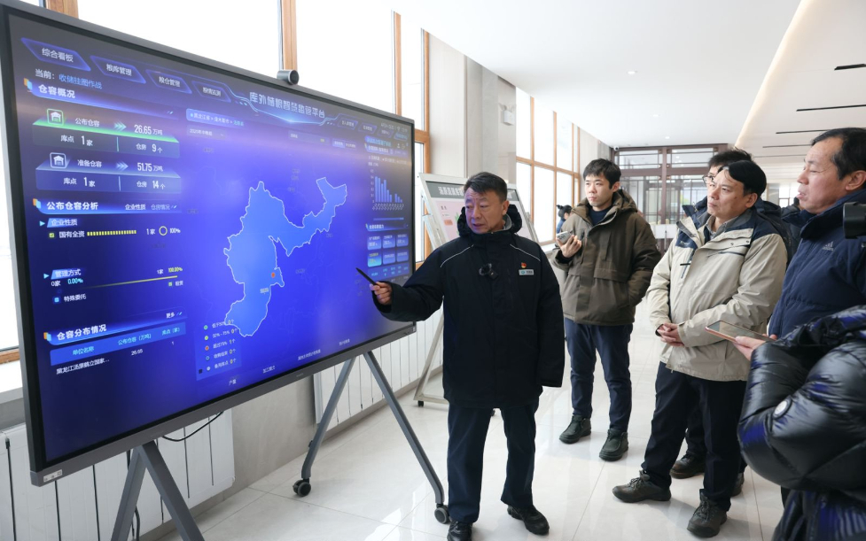 针对库外储粮这一监管难点,中储粮集团大力推广库外储粮智慧监管平台和“挂图作战”系统。在中储粮集团黑龙江分公司,监管平台已对数百个外租库点实现了“三看、两管、一预警”功能,以及“看得见,管得住”的监管目标。“挂图作战”则像一张实时动态地图,直观展示各库点仓容、收购进度、人员设备状态,便于指挥中心科学调度资源。中储粮集团黑龙江分公司综合处处长王工一表示,“‘挂图作战’可视化系统让我们从‘电话调度’升级为‘看图指挥’,它能实时、直观告诉我们哪个区域需要增开库点,哪个库点需要延长作业时间,实现从资源的分散管理到精准调配,极大提升了管理效率和响应速度。”