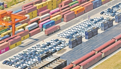 图为等待装车出口的新能源汽车。