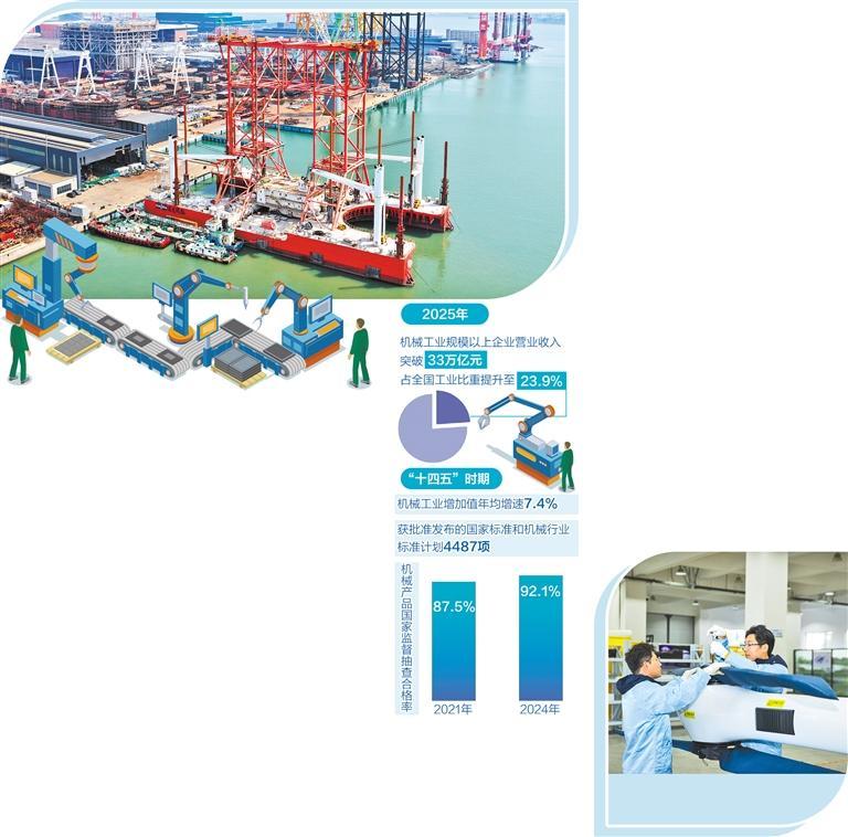 一项项突破,印证了机械工业在复杂环境中展现出的强劲动能。“十四五”时期,机械工业增加值年均增速达7.4%。规模以上企业数量从9.2万家增至13.7万家,资产总额突破40万亿元。2025年,机械工业规模以上企业营业收入突破33万亿元大关,占全国工业比重提升至23.9%。