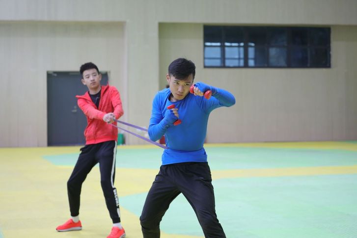“通過啞鈴鍛煉肩部耐力,腳腕綁沙袋練習(xí)移動速度,用杠鈴加強出拳力量和爆發(fā)力,配合手靶全面練習(xí)。因為是從零開始,要想拿到成績,必須付出成倍的努力?!壁w佳偉說。