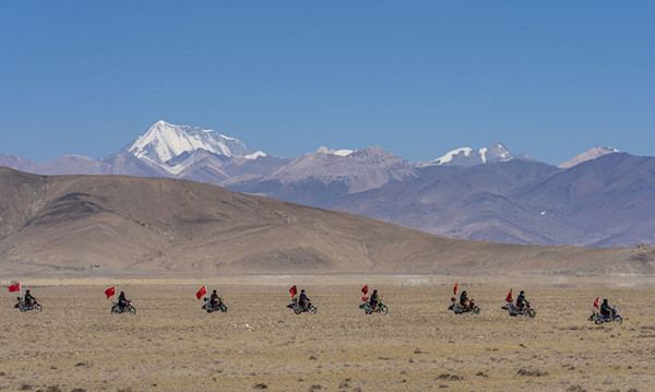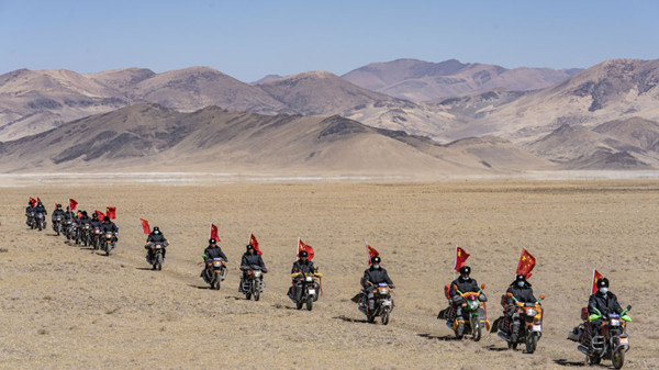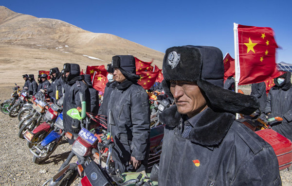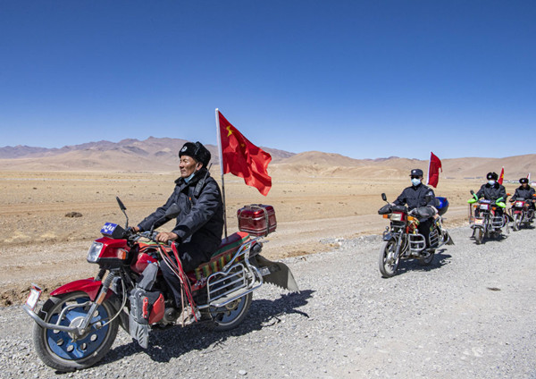 西藏日喀則市薩嘎縣昌果鄉(xiāng)的一處村莊里,48歲的藏族漢子石覺塔布在風(fēng)中跨上一輛摩托車,向平坦無垠的高原邊緣騎去。他的車尾插著一面五星紅旗,被風(fēng)吹得獵獵作響,即便駛出很遠,那抹紅色在車輪卷起的煙塵中也依然醒目。