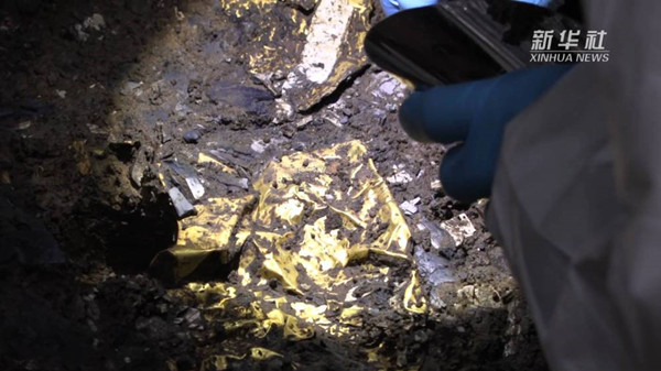 此次新發(fā)現(xiàn)的6個坑狀祭祀遺跡在第1、2號祭祀坑旁。面積僅3.5平方米的5號祭祀坑內一片金光閃閃,已清理出多件金器、玉質管珠和象牙飾品等。正在發(fā)掘的3號祭祀坑每天都有新發(fā)現(xiàn),6號祭祀坑確認一具“木匣”,長約1.5米、寬約0.4米,木匣內外均涂抹朱砂,目前尚不能確認其用途。