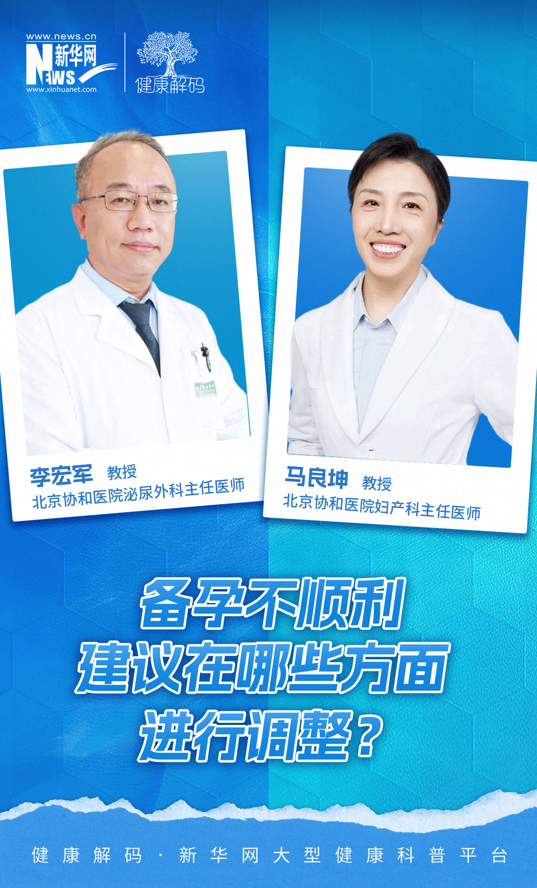 女性和男性不孕的常见原因分别有哪些,如何进行科学的诊断和治疗?本系列节目我们邀请了北京协和医院妇产科主任医师马良坤教授、北京协和医院泌尿外科主任医师李宏军教授共同分享《备孕不顺利 建议在哪些方面进行调整?》。