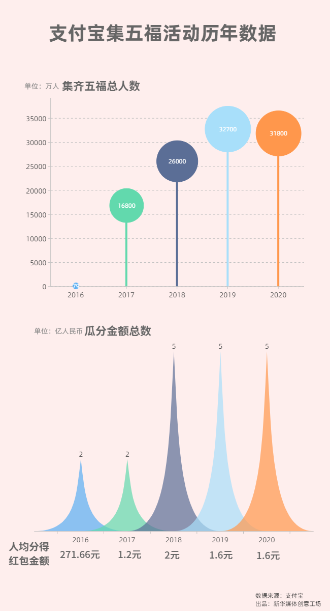 自2016年支付寶推出“集五?!钡幕顒?dòng)至今已有五個(gè)年頭。從最開始只有幾十萬用戶參與,到如今幾億人共同狂歡。支付寶數(shù)據(jù)顯示,截至2月11日零點(diǎn),支付寶集五福活動(dòng)共寫下近5.7億個(gè)福字,共2.6億網(wǎng)友在線上手寫了福字,送給親朋好友,其中還有350萬福字通過支付寶打印、寄送回家。今年參與紅包拜年的用戶上漲了近270%,“紅包”相關(guān)搜索量也隨之大漲538%。